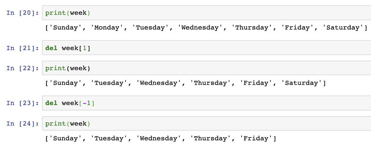 면, 인덱스의 값을 -1 로 주면, 맨 끝의 값에 해당되므로, del week[-1] 을 이용하면 된다.