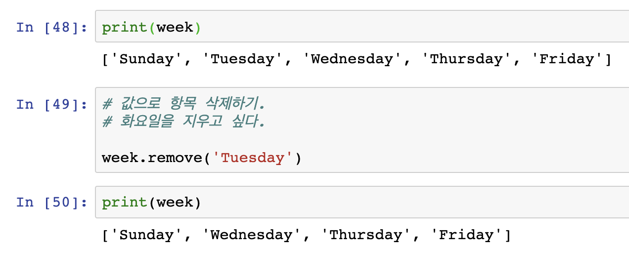 따라서 week.remove('Tuesday') 를 해주면, 아래처럼 삭제가 된다.