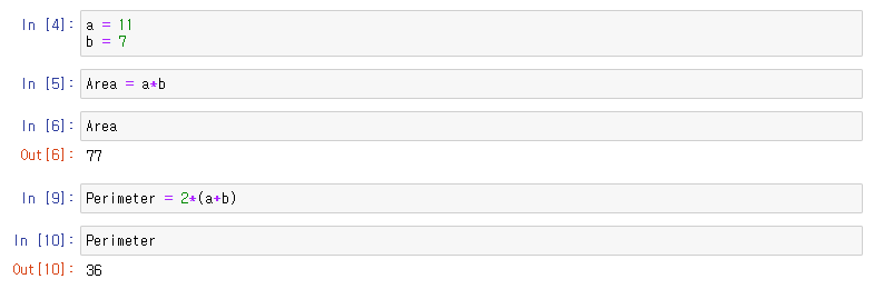1. 넓이와 둘레길이를 구하는 코드를 만드세요. a는 11, b는 7일때의 넓이와 둘레의 길이를 구하세요.