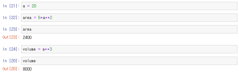 3. a의 길이가 20으로 주어졌을때, 표면적(area)와 부피(volume)을 구하세요.