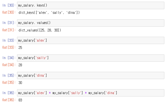 ▶ my_salary = { "alex": 25, "sally": 28, "dina": 30 }
