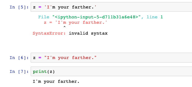º 파이썬에서 문자열은, 싱글퀏(작은따옴표 ' ) 이나 더블퀏 (큰따옴표 ") 로 양 끝을 감싸줘야 한다.