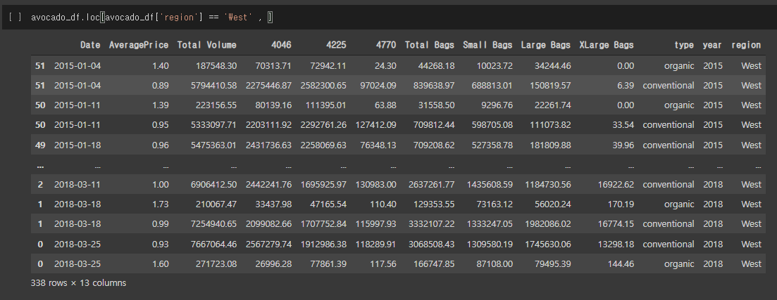 avocado_df 라는 데이터프레임에서 region 컬럼의 내용이 west 인 아보카도의 가격을 예측하시오.