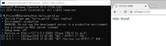 [그림 3] hello_world.py 실행 후, http://127.0.0.1:5000으로 접속