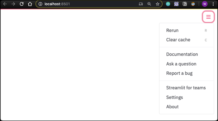 Streamlit은 8501 포트에 앱이 실행된다. 일단 지금 아무 것도 없는 상황에서는 우측 상단 버튼만 있는 페이지를 볼 수 있다.