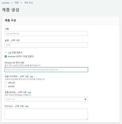 19. S3 를 선택하고, 여러분 아이디-lambda-layers 라는 버킷을 만든다.
